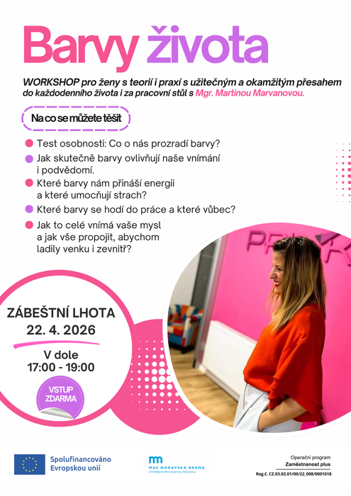 Srdečně zveme všechny ženy na barevný worskhop/přednášku BARVY ŽIVOTA, jež se bude konat ve středu 22.04.2026 V dole od 17 hodin. Obvyklá cena je 200 Kč za osobu, díky MAS Moravská Brána máte vstupné plně hrazeno. Worskhop vede paní Mgr. Martina Marvanová a dozvíme se o vlivu barev na naše vnímání i podvědomí, které barvy se kam hodí a jak to celé vnímá naše mysl. Občerstvení zajištěno. Těšíme se na vás!