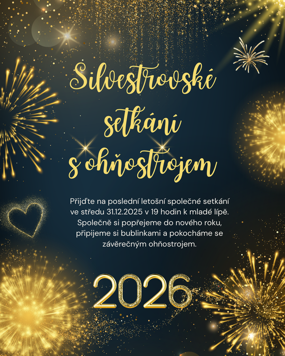 Srdečně Vás zveme na poslední letošní společné setkání ve středu 31.12.2025 v 19 hodin na prostranství u mladé lípy. Společně si popřejeme do nového roku, připijeme si bublinkami a pokocháme se závěrečným ohňostrojem. Zároveň upozorňujeme na platnost nové vyhlášky, která razantně omezuje používání pyrotechniky na území celé naší obce. Více informací o této vyhlášce včetně mapy zakázaných míst najdete na webu obce. Těšíme se na Vás!