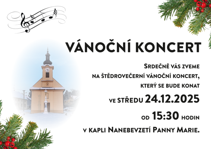 Srdečně Vás zveme na ŠTĚDROVEČERNÍ VÁNOČNÍ KONCERT, který se bude konat ve středu 24.12.2025 od 15:30 hodin v Kapli Nanebevzetí Panny Marie. Těšíme se na Vás!