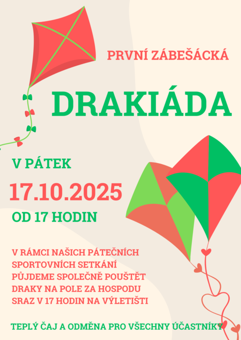 Srdečně zveme všechny děti i dospělé na první Zábešáckou DRAKIÁDU. V rámci našich společných sportovních pátečních setkání se tentokrát vydáme pouštět draky na pole za hospodu. Každý účastník dostane odměnu a připraven bude také teplý čaj na zahřátí. Těšíme se na Vás!