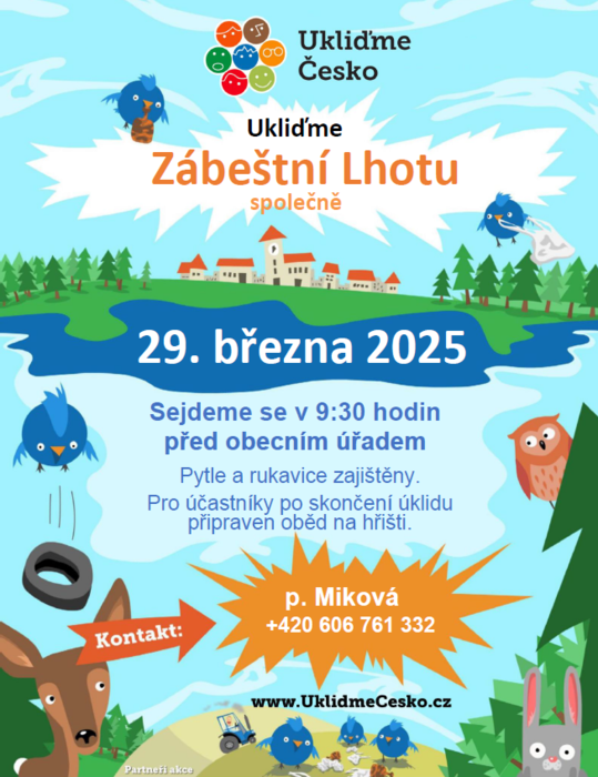 Zveme všechny šikovné a obětavé ruce na jarní úklid obce a jejího okolí. Budeme se na Vás těšit v sobotu 29.03.2025 v 9:30 před obecním úřadem.