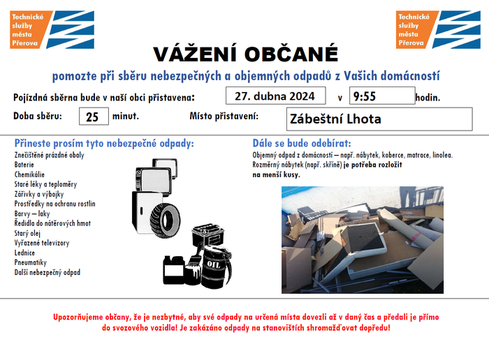 Do kontejnerů je zakázáno ukládat stavební suť! Lze zde odkládat vyřazené kusy nábytku, matrace, koberce, podlahovou krytinu, vany, umyvadla apod. Velkoobjemové kontejnery na objemný odpad nejsou určeny pro odpad ze stavební činnosti, elektrozařízení - jako jsou televizory, monitory, ledničky, počítače - dále pak akumulátory, baterie, pneumatiky apod. Tyto věci lze donést v rámci svozu nebezpečného odpadu, který proběhne v naší obci 27.04.2024 před obecním úřadem v 9:55 hodin.